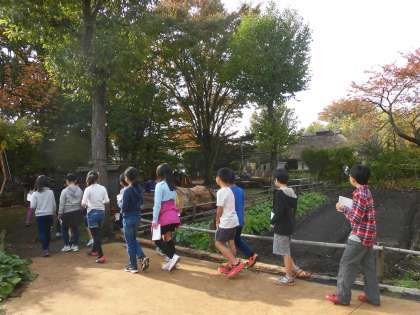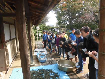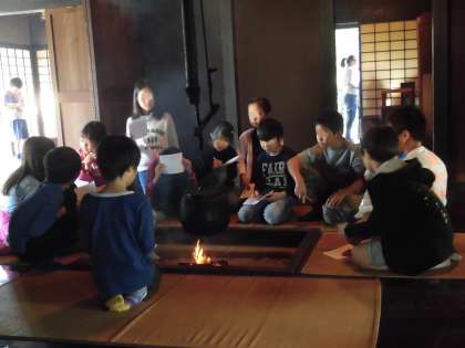 先生からそばの実のことを教えてもらい、一生懸命に観察する3年生です。古民家の中に入れさせていただき、囲炉裏の周りでくつろぎました。火のあたたかさやぬくもりを感じていました。