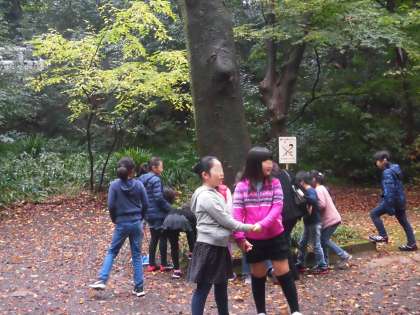 等々力渓谷の小さな広場で、少しの時間だけ自由時間になりました。友達と仲良く楽しく過ごしていました。自然や虫が大好きな子もたくさんいて、等々力渓谷の自然をたくさん観察することもできました。