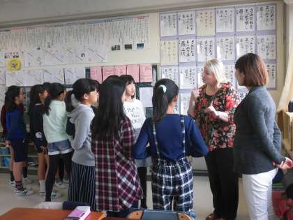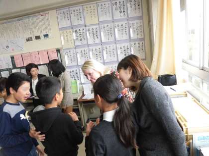 授業が終わった後は、カリフォルニア大学の先生方に子供たちが英語で話しかけました。子供たちに合わせてゆっくり英語でお話してくださる先生方とコミュニケーションを図ることができました。積極的な子供たちの態度、英語で話そうとする前向きな心が6年生から伝わってきました。休み時間のすてきな光景でした。近い将来、世界に羽ばたいていく子供たちの姿を思い浮かべ、子供たちの活躍場の大きさに思いを馳せるそんな瞬間でした。