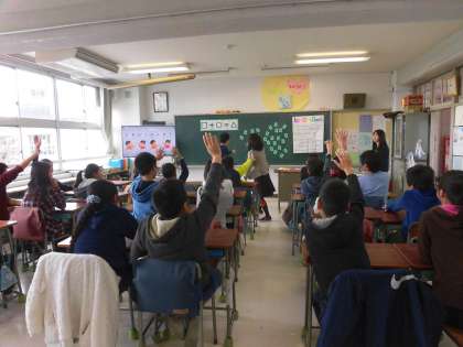 次のアクティビティは、1〜30の数字を使ったゲームです。楽しいゲームを通して、子供たちは何度も英語で数字を考え、伝えていきます。英語を使うことを楽しむ6年生の姿がありました。今日は、カリフォルニア大学から私たちの教員の英語活動の授業を指導してくださる先生方が来校されました。子供たちの積極性、英語に親しもうとする前向きな態度にお褒めのお言葉をたくさんいただきました。