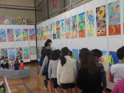 11月25日・26日の2日間、池之上小学校展覧会が開催されます。展覧会のテーマは「夢をえがこう みんなの作品 宝物」です。今日は第1日目、子供たちが自分の作品、友達の作品を鑑賞しました。友達の作品のよさをたくさん見つけることができました。どの作品も力作です。テーマにあるように「宝物」がたくさん詰まった体育館になりました。共同作品も展覧会に花を添えます。たくさんの皆様のご来校を心からお待ちしています。