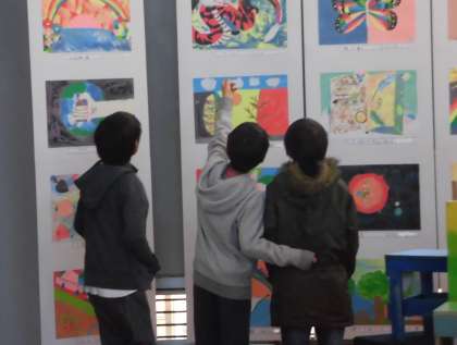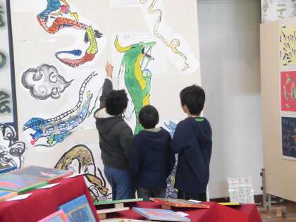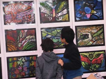 5・6年生も鑑賞を楽しみました。全校の友達の作品をじっくり見る機会はなかなかつくることができません。みんなていねいに一つ一つの作品を鑑賞していることが後ろ姿からもよくわかります。