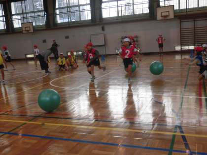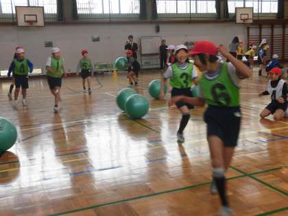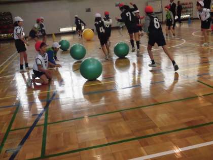 Gボールを使って、トリオ対抗「バールパニック」を行いました。相手が投げてくるGボールをよけながら決められたコースを走り抜ける活動です。体を巧みに動かしながら運動を楽しむ子供たちの姿がありました。
