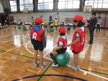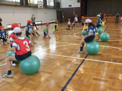 Gボールに乗ってバウンドを楽しみました。リズムに合わせたり、移動したりしながらGボールを使った運動を楽しみました。「楽しい!」という言葉が子供たちから沸き起こりました。笑顔もいっぱいです。Gボールの特性を生かした活動を行うことで、こんなにも生き生きと運動を楽しむ子供たちの姿を見ることができたことは研究の成果の一つです。