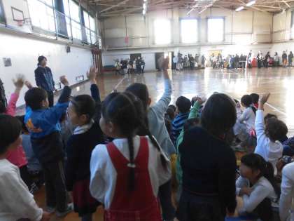 先生が、聴いてくださった保護者の皆様にもありがとうを伝えようと呼びかけると、みんなで手を振る2年生。満足感がいっぱい伝わってきます。