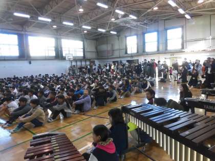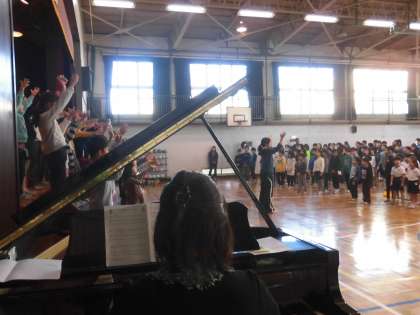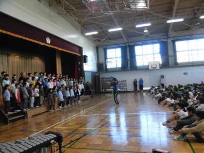 心を込めて歌う2年生と一生懸命に聴く全校の子供たち。保護者の皆様にもたくさんお集まりいただきました。