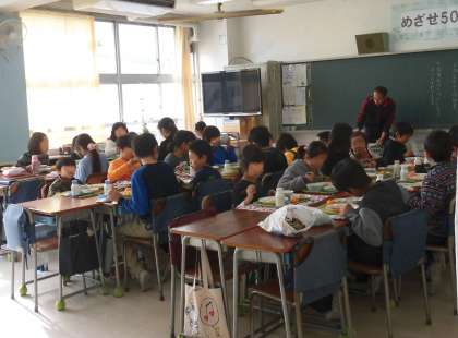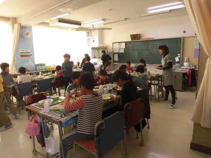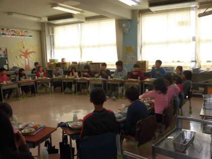 給食準備が終わると、なかよし班のみんなでランチタイムです。少し緊張の様子もありましたが、次第に和やかな雰囲気になり、いつものように楽しい給食の時間をすごしました。班によってグループの作り方も様々です。