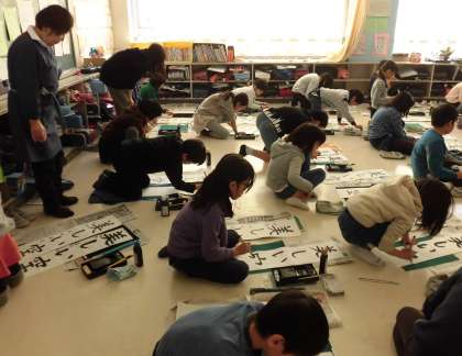 4年生も書き初めの練習を行いました。「美しい空」という字を書きます。今日も地域の皆様にご支援いただきました。子供たちにあたたかな声かけを行っていただきました。