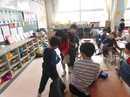 みんなで考えた出し物を楽しむ子供たち。クラスゲームの時間もあり、ドンじゃんけんやリーダーさがしを楽しみました。笑顔いっぱいです。