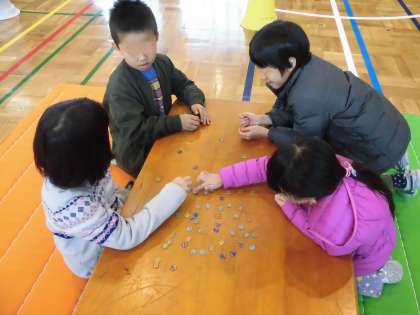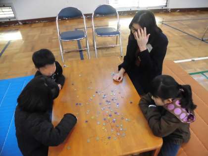 おはじきの様子です。ニュージーランドから日本に来て、都立高校で英語を教えているお姉さんも一緒に昔遊びを楽しみました。子供たちもすぐに仲良しになれました。