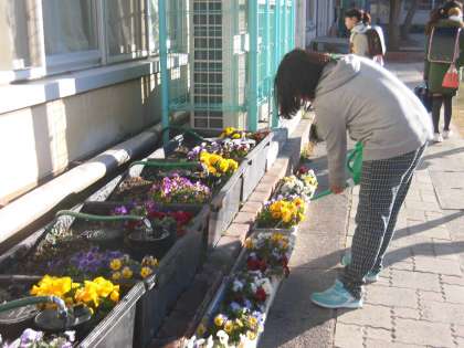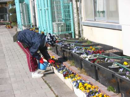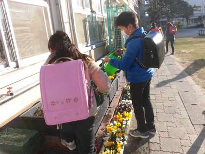 学校の校庭にある花壇にパンジーとチューリップが植えられています。花を植えてくれた整美委員会の子供たちが毎日欠かさず水やりを行っています。学校主事も花がらを丁寧に摘んでいます。こうした努力のおかげで、次から次へと花のつぼみをつけ咲き誇るパンジー。子供たちの元気いっぱいの様子をいつも見守ってくれているかのようです。