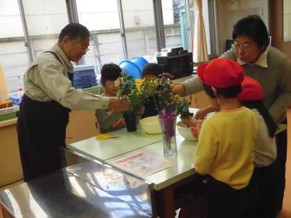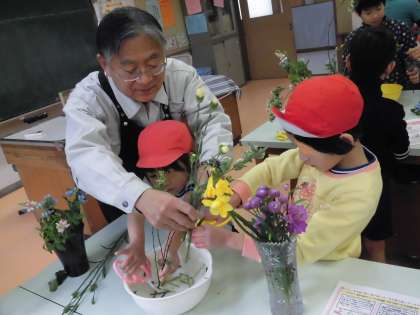 2月の花を生ける活動の様子です。今日の花は「コデマリ」「オキシペタラム」「ルピナス」「スプレーカーネーション」です。かわいらしい花たちを子供たちの創意工夫で生けました。1年生も上手に生けることができるようになってきました。中には、1月に生けた花をていねいに育て、その花も一緒にアレジメントしている子供たちもいました。ラン科の「モカラ」や「フリージア」はまるで今日いただいた花のように生き生きと命をつないでいました。子供たちの愛情あふれるお世話のおかけです。