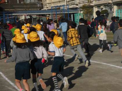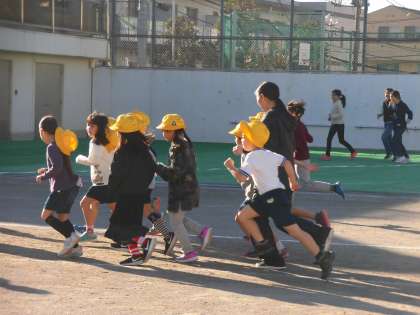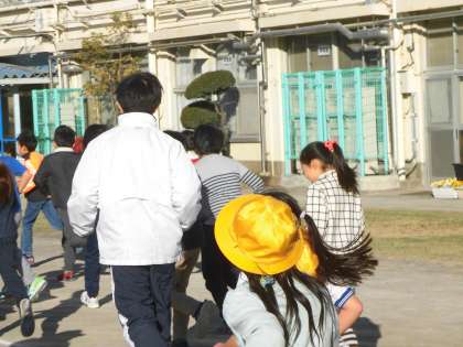 1年生も一生懸命に走ります。音楽が流れる前から走り始めている子もたくさんいます。担任の先生が一緒に走ってくれると子供たちも心強く感じているようです。走り終わった子供たちの手はとっても冷たくなっていますが、さわやかな笑顔で「10周走ったよ」「ぼくは12週」など、自分のがんばりを報告してくれました。
