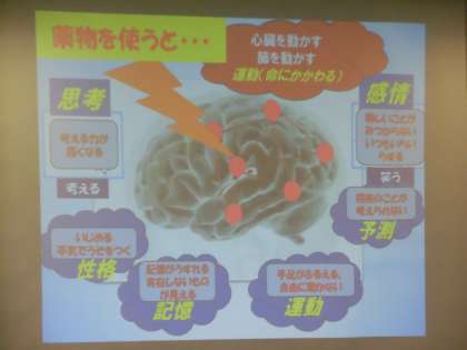 薬物乱用防止の3つの柱をていねいに教えていただきました。第1は「薬物の危険性」です。脳に関する科学的なお話を分かりやすくしていただきました。1度、脳の中に入ってしまった薬物はずっと残り続けてしまうそうです。第2は「判断力の大切さ」、そして第3は「自己肯定感を育むことの大切さ」です。自分を大切にする、命を大切にする心や態度を醸成することは、子供たちが豊かに生き抜くうえでとても重要です。たくさんのことを教えていただきました。