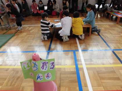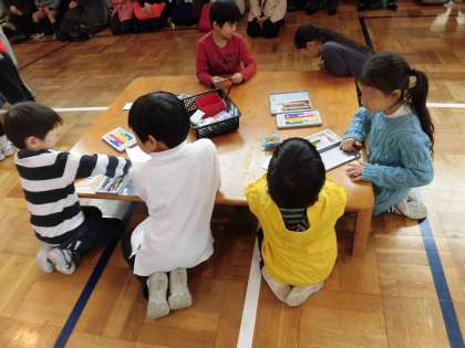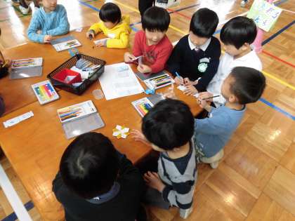 ぱっちんがえるです。作り方を教えてあげる1年生。やさしさでいっぱいです。
