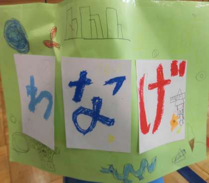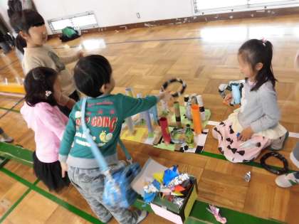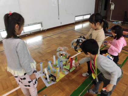 輪投げです。手作りの輪と的になる棒を一生懸命作った1年生。そのおかけでみんな輪投げを楽しめました。「輪投げコーナーにきてください」「楽しいですよ」と大きな声で呼びかけも行っていました。