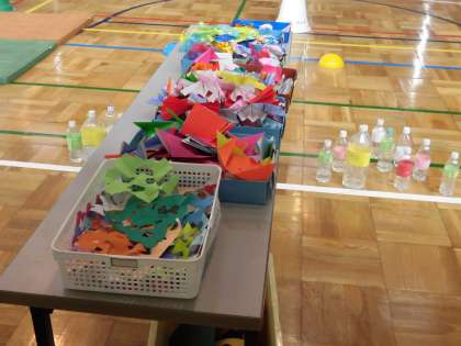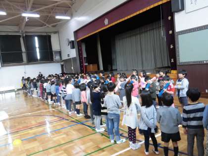 2月23日、4月から新1年生になる幼稚園・保育園の小さなお友達をお迎えするために1年生の子供たちが「わくわくパーティ」を計画しました。そして「新しく入学する1年生を楽しませるためにがんばろう」を合言葉にたくさんの準備をしてきました。今日は、その本番の日です。受付を終えた幼稚園・保育園生と手をつなぎ、案内する1年生から思いやりの気持ちが伝わってきました。お迎えの演奏も行いました。体育館には手作りコーナーがたくさん並んでいます。喜んでもらうために作った手作りのプレゼントもいっぱいです。