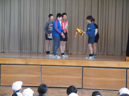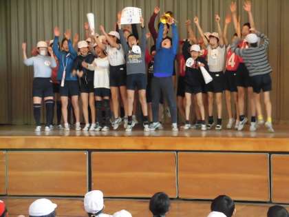 5年生から賞状と手作りトロフィーを授与される6年生。舞台の上でみんなで喜びを表現しました。5年生の実行委員の子供たちが中心にフェスティバルの進行を行いました。そして、5年生全員が6年生への感謝の気持ちでフェスティバルを盛り上げました。6年生も5年生の思いに応えるかのように、最後まで元気に明るくこのフェスティバルを楽しんでいました。5年生と6年生が一緒につくりあげたフェスティバル。それぞれの思いがいっぱい詰まったすてきな「お別れスポーツフェスティバル」になりました。