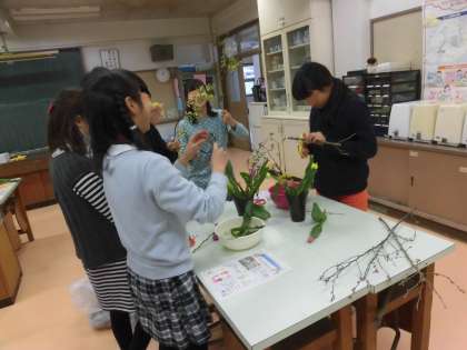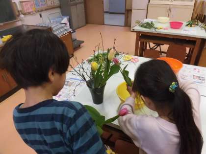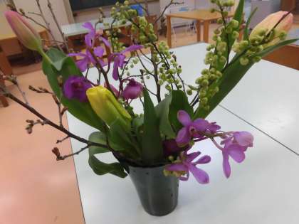 桜とチューリップが春を届けてくれます。桜の枝の高さと広がりがチューリップを囲むように見守ります。作品は6年生のものです。驚いたことに、1月12日に生けた「モカラ」の花がまだしっかり咲いています。きっと、一生懸命にお世話をしているのでしょう。生命力の素晴らしさと子供たちの責任感の大きさを感じました。