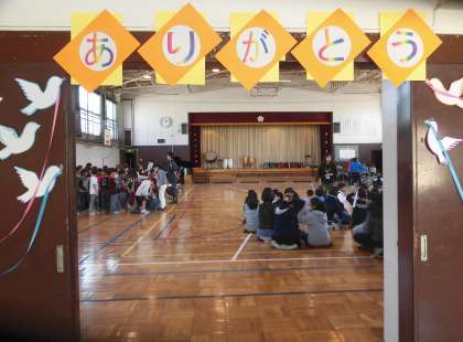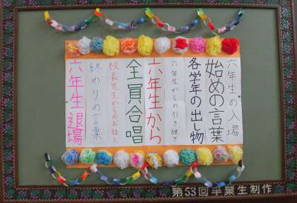 6年生を送る会のために、各学年が飾りつけの分担を行いました。体育館入口の羽ばたく鳥と「ありがとう」のメッセージを1年生、花のアーチにつけるお花を2年生と3年生、アーチ作りを4年生、ギャラリーに飾る贈る言葉「一期一会〜物語はこころからはじまる〜」を5年生が担当しました。くす玉やプログラムは代表委員の子供たちが作りました。みんなの心が一つになり、心あたたまるすてきな会場になりました。