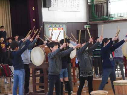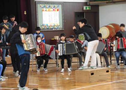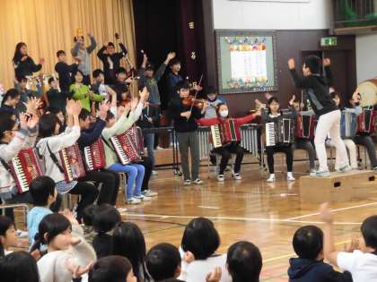 1年生から5年生までのすばらしい出し物に6年生が「返礼」しました。最初に5年生に引き継ぐ和太鼓の力強い演奏がありました。2曲目は「情熱大陸」です。6年生が力を合わせて創り上げた音楽に、見ている側はぐんぐん引き込まれます。6年生の演奏する姿には凛とした美しさがありました。豊かに曲を創り上げる表現者としてのメッセージも伝わってきました。この6年間の成長の大きさを感じる瞬間でした。演奏が終わると会場から大きなアンコールが起き、すてきな演奏をもう一度聴くことができました。6年生はいつも在校生のあこがれの存在です。