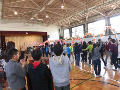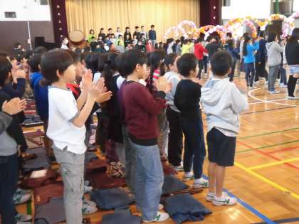 3月7日、全校のみんなが大好きな6年生に感謝の気持ちを伝える「6年生を送る会」が開かれました。この日を迎えるために、どの学年も練習を重ねてきました。自分たちでたくさんアイディアを出し合い創り上げてきました。今日は5年生がリーダーシップを発揮しました。司会進行は4年生と5年生が協力してがんばりました。最初に6年生を花道で迎えます。みんなの大きな拍手が体育館に鳴り響きます。