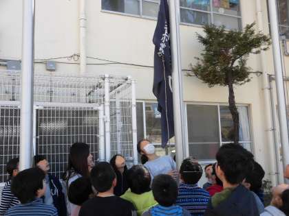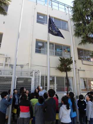5年生が様々な場で活躍しています。6年生からバトンを引き継ぎ、なかよし班のリーダーや全校朝会のあいさつ、行事の際の準備や片付けなどほんとうによく頑張っています。学校の校章旗を毎日、掲揚する役割も5年生がバトンタッチしました。先生と校章旗の掲揚の仕方やひもの結び方を教わりました。子供たちも真剣に校章旗を見つめています。これからの自分自身の役割と責任を感じていたようです。