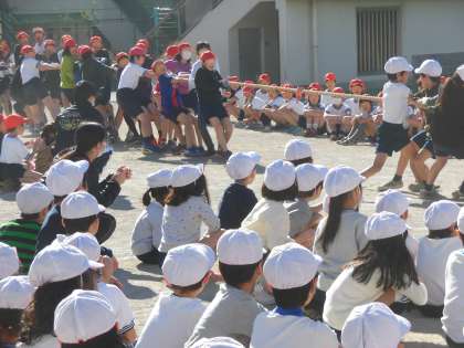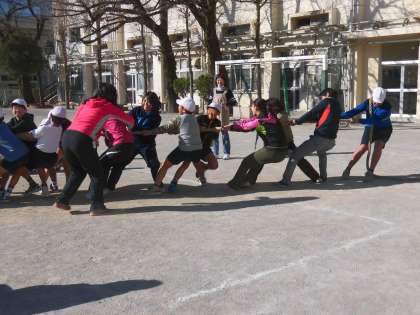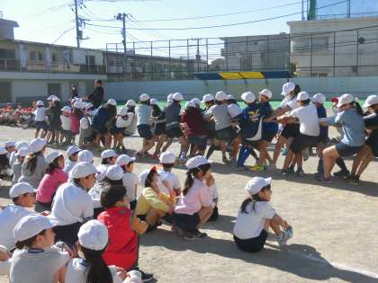 最後に、5年生対6年生の試合です。下級生から「6年生がんばって!」とかわいい応援の声が上がりました。5年生には先生たちも応援に入りました。それでもさすがは6年生、見事に勝利しました。応援もみんなでがんばり、楽しい体育朝会になりました。
