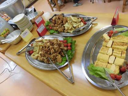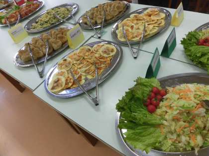 3月14日、6年生の卒業をお祝いして、給食室から「バイキング給食」のプレゼントがありました。給食室では、通常のメニューに加えフル回転で子供たちの好きなメニューをたくさん調理してくださいました。6年生も「おいしそう!」とうれしそうです。見てください。ほんとうに豪華なバイキングになりました。