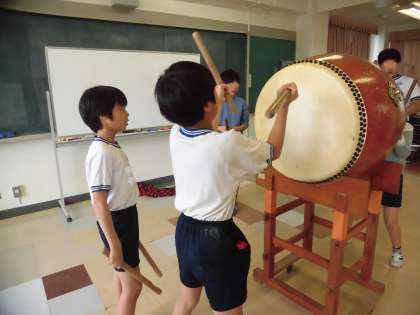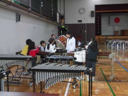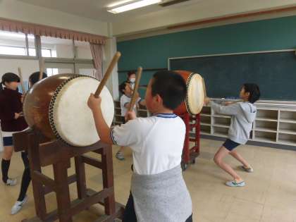 昼休み、体育館やすくすくルームから太鼓や木琴などの音色が聴こえてきます。体育館では1年生が入学式の練習をしていました。すくすくルームでは5年生が和太鼓の練習に励んでいました。5年生と6年生は和太鼓の引継ぎを行っています。5年生は6年生からたくさんことを学び、自分の力にしてがんばっています。この時間は5年生の自主練習です。活気あふれる池之上小学校のお昼のひとときです。