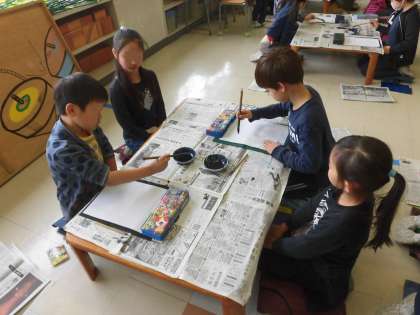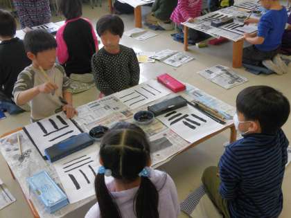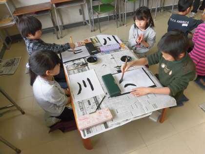 2年生の教科「日本語」の様子です。今日は、「筆を使って文字を書こう」の学習に取り組んでいました。「筆」とはどんなものかを知り、実際に筆を使って文字を書いてみました。子供たちは、墨のにおいをしっかり感じとりながら、正座をして少し緊張気味です。「上手に書けるかなあ。」「もっとやってみたいなあ。」など、筆で文字を書く日本の伝統的な活動に関心を高めながら、「三」「川」という文字を書きました。3年生から始まる毛筆の時間を楽しみにする子もたくさんいました。