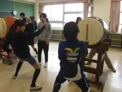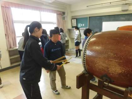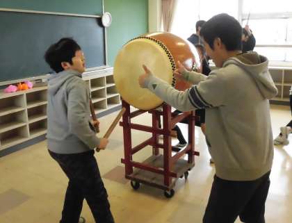 昨日は、5年生が主体的に練習していた和太鼓でしたが、今日は6年生がこれまで培ってきたことを5年生に教えていました。腰を落として力強くたたく方法を一生懸命に伝える6年生。がんばったことを「いいね!」とほめる言葉もたくさん聞くことができました。6年生の熱意を5年生もしっかり受け止めています。5年生と6年生の心の絆のように、和太鼓の力強い音が鳴り響きました。
