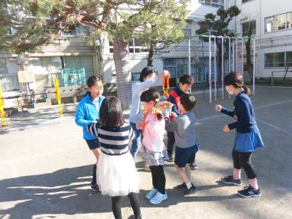 最後までじゃんけんで勝ち残ると、集会委員の子供たちの手作りメダルが贈られました。金メダル・銀メダルをもらうためにみんな真剣にゲームに向かっていました。ほんとうに楽しそうです。メダルを大切に首にかける子供たちもたくさんいました。メダルが少し余ったことを受け、集会委員の5年生が何やら相談しています。「このメダルを6年生に贈りたいね。でも、全員分はないなあ。」と悩んでいると、6年生の集会委員が登場して「5年生にメダルをかけよう。」「担当の先生におくろう。」と声かけしてくれました。すてきな5年生と6年生の姿を見て、うれしく思いました。集会委員の5・6年生は、いつも全校のみんなが楽しめる企画と準備に前向きに取り組んできました。心のこもった集会をありがとう。