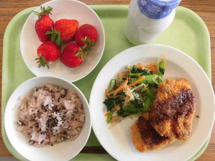 3月22日、平成28年度最後の給食の日でした。今日の給食は、6年生の卒業をお祝いする献立です。赤飯、かつフライ、おひたし、いちごが並びました。給食室からメッセージが届きました。「今日は、6年生の卒業をお祝いする献立です。また、みなさんの進級をお祝いする献立です。楽しい給食時間をすごしてくださいね。4月に、ご進学したみなさんにお会いできるのを楽しみにしています。給食室一同」この一年、苦手なものを食べることができるようになったと自分のがんばりを振り返る子がたくさんいました。給食をいっぱい食べて元気に成長しました。