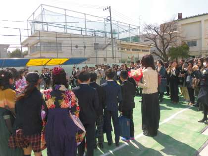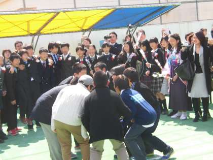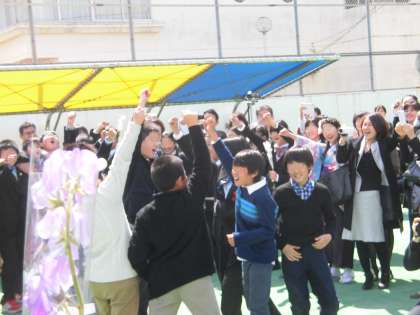 とうとう6年生が思い出での校庭を去るときがやってきました。最後の円陣を組む卒業生。お別れは寂しいけれど、子供たちの満面の笑顔を見ていると希望に胸ふくらみます。花道をつくって卒業生を見送った5年生も円陣の中にやってきました。卒業生と5年生が何やら相談をはじめました。バトンを引き継いだ5年生と卒業生が力を合わせて行う最後の共同作業。みんなの心がまた一つに重なりました。感動的な場面でした。互いに認め合い、助け合い、共に池之上小学校に通った仲間としての絆を感じました。6年生、卒業おめでとうございます。5年生、4月からの学校をよろしくお願いします。