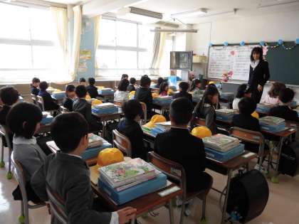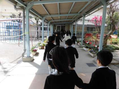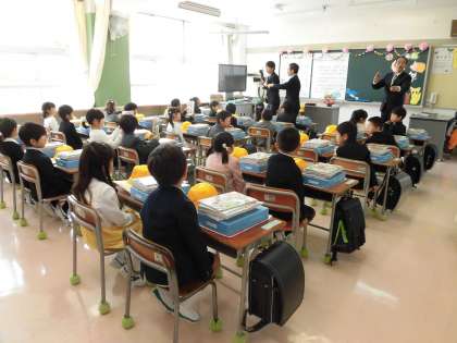 入学式が始まる前の教室の様子です。新1年生は少し緊張気味です。でも、優しい6年生にお世話してもらい、笑顔もたくさん見られました。いよいよ入学式がはじまります。