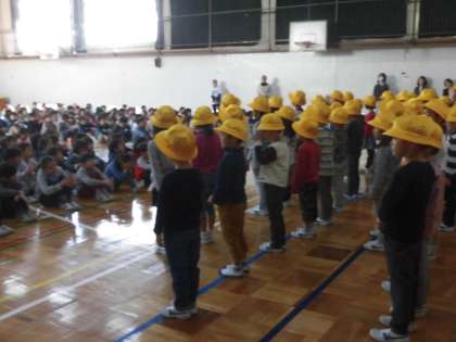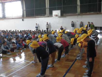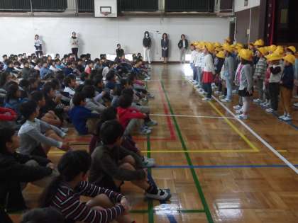 4月10日、新1年生と全校児童の対面式が行われました。まだ入学して4日目ですが、「おにいさん、おねえさん、よろしくお願いします。」とみんなで声をそろえてあいつさをする1年生を、全校の子供たちがやさしく拍手で迎えました。今日から朝会も一緒に参加です。その後の全校朝会でも静かに立派な態度で臨むことができました。