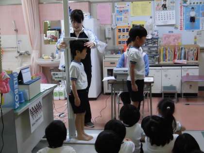 今日は、体重と身長の計測が行われました。保健室の先生から、健康診断を受けるときに大切なこと、守ってほしいことなどについてお話がありました。「成長は一人一人違うこと」「体のことは自分の心の中だけで受け止めること」などについてです。計測にあたって、うわばきを脱ぎますが、さすが池之上小学校の子供たちです。しっかりそろえています。
