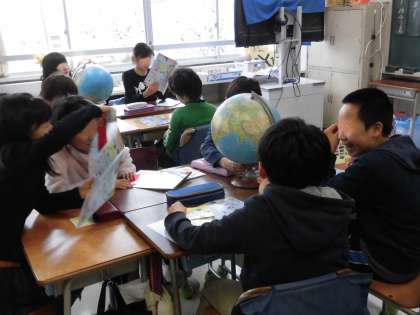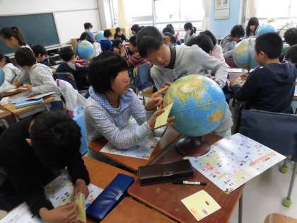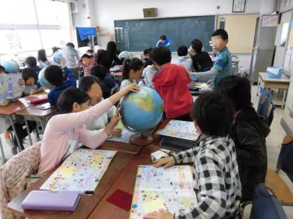 5年生が社会の学習に取り組んでいました。地球儀を活用して、世界の国々の国旗と位置を確認していました。グループでよく話し合っています。世界に目を向けている子供たち。きっと近い将来、世界で活躍する人に育っていくことでしょう。