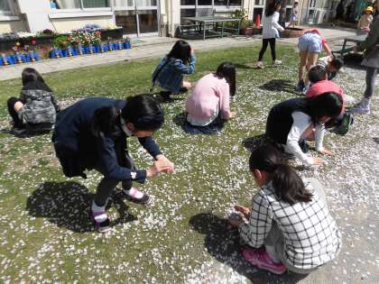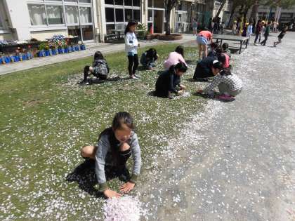 桜の花も満開を過ぎ、ひらひらと花びらが舞い降りてきます。子供たちは、花びらを手で受け止めたり、「ピンクのじゅうたんだね」と話しながら美しい風景を眺めたりしていました。芝生にたくさんの花びらが敷き詰められました。1年にたった数日しか味わうことのできない自然とのふれあいを子供たちは存分に楽しんでいました。