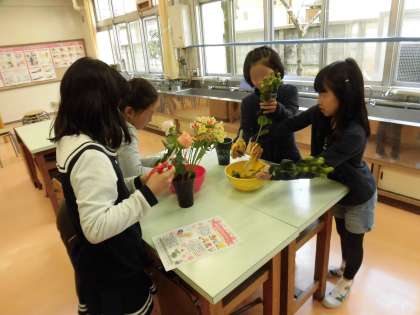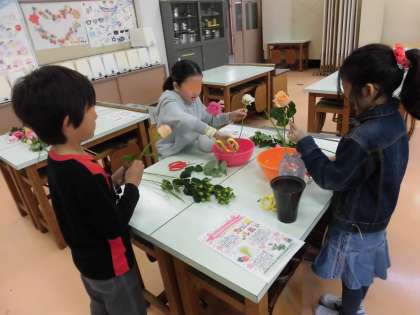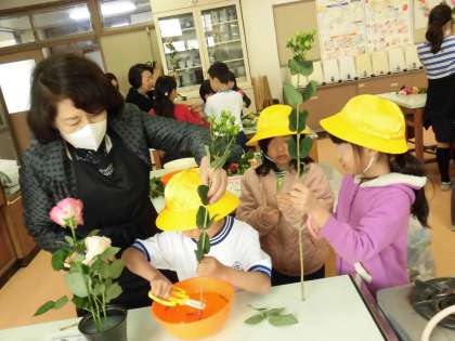 今年度もまた毎月1回「花を生ける活動」が行われます。お花はワンコインクラブの皆様からご提供いただきます。季節のお花を1年を通して感じることができることは、ほんとうに幸せなことです。毎月、このお花を生ける活動を楽しみにしている子供もいます。1年生の初めての活動でしたががんばりました。「今日もいいことがあったね。今日もいい日。」と友達と話している姿もありました。今日は、春の花「バラ」「ヒペリカム」「スモークグラス」をアレンジメントしました。子供たちが生けたお花が教室を豊かにしてくれます。