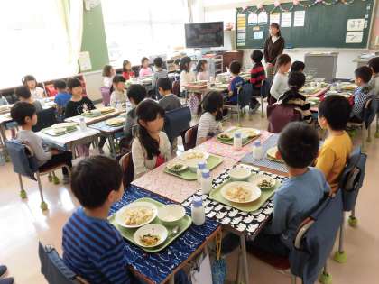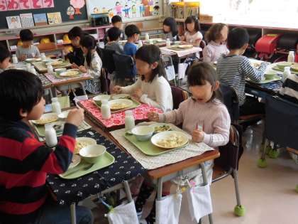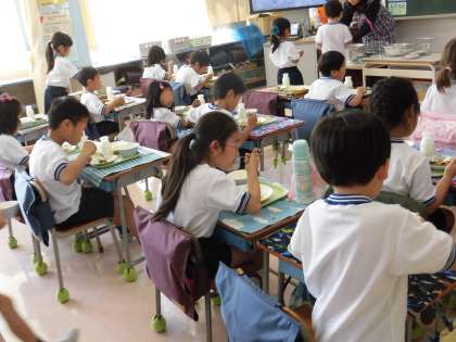 準備が終わると、待ちに待った「いただきます」の時間です。楽しそうに、そして、落ち着いて食べている子が多くて感心しました。これからの学校で威喝の中で、いっぱい勉強して、いっぱい遊んで、おいしい給食をいっぱい食べて元気な毎日を送ってほしいと願っています。