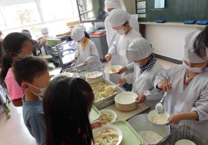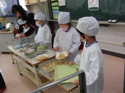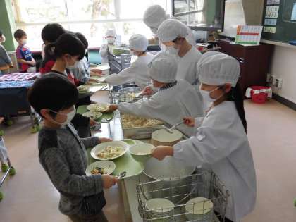 給食当番の子供たちは、先生から教えてもらったことをしっかり意識して、上手に給食の配膳を行っています。受け取る子供たちも、お盆をまっすぐ平らに、両手でしっかり持っています。みんな給食の準備がとても上手です。