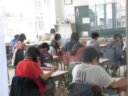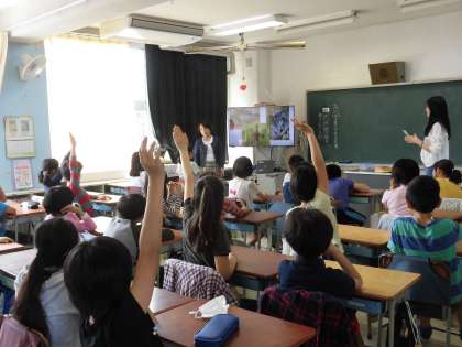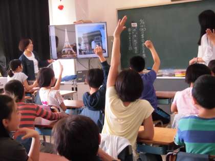 3時間目の授業の様子です。写真は5年生の英語の時間です。世界の様々な食文化や建造物などを見たり、英語活動支援員の生きた英語を聞きながら、その特徴から世界の国を考える授業でした。映像に映っているのはエッフェル塔・・・子供たちはすかさず「フランス!」と答えていました。隣の6年生は、学力調査を行っていました。今日は、全国学力・学習状況調査です。この調査を分析し、授業改善に生かしていく予定です。