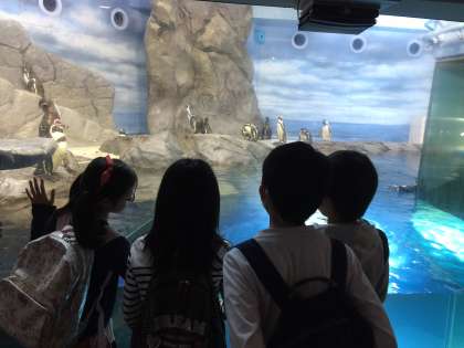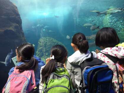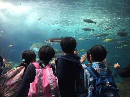 大きなエイ、群れをつくって力強く泳ぐ魚、きれいな模様に感嘆の声を上げながら、6年生と5年生が仲よく行動しています。
