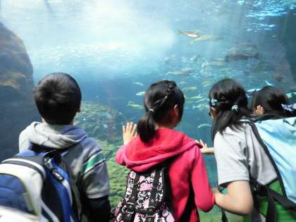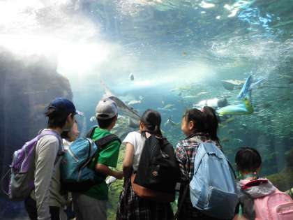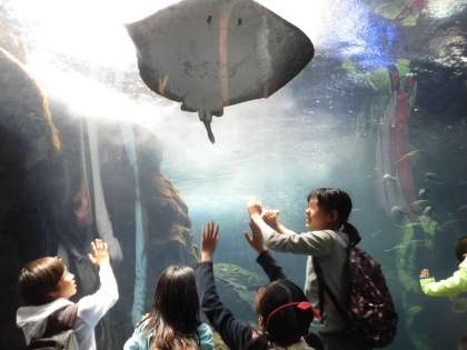 昼食後もグループでもう一度見たいところを中心に見学しました。大きなエイが悠々と泳ぐ姿に心弾ませ、思わず手を伸ばしたり、何百匹と群れをつくって泳ぐ雄大さに驚いたりする子供たちの表情が明るく輝いていました。