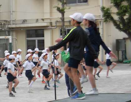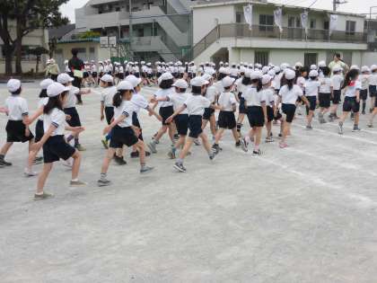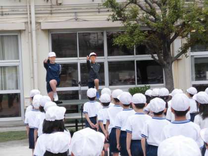 運動委員会の6年生が行進の手本を見せてくれました。6年生のまっすぐ伸びた手や、二人の息がぴったり合った足の動きを見ながら、みんなで心ひとつにして行進する練習をしました。