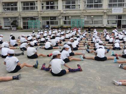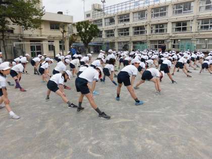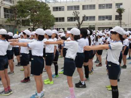 今年度初めての体育朝会が行われました。今日は、体育の授業や運動会のときに実践する運動の基礎となる整列や準備体操、行進の仕方や服装の整え方などを確認しました。