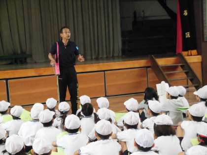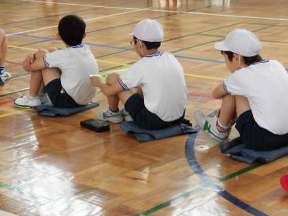 遠足では、なかよし班のグループを活用して、グループ行動をします。安全には十分に気をつけるよう担任から話がありました。引率教職員で公園内を巡回します。子供たちには水筒などを利用して防犯ブザーを身につけるよう話がありました。3・4年生の保護者の皆様におかれましては、当日の防犯ブザー着用にご協力のほどお願いいたします。今日も、安全対応の一つとして防災頭巾を体育館に持参しています。