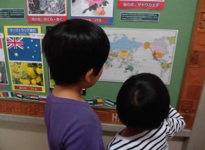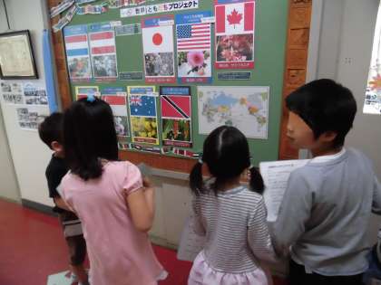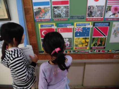 校長室前でも案内が続きます。掲示板に貼ってある「世界ともだちプロジェクト」を見ながら、「月曜日にお話ししてもらった国の旗と花だよ。」と説明してあげる2年生もいました。クイズを出しながら、1年生と2年生の会話がどんどん展開していきます。子供たちの言葉のキャッチボールはこんなふうに広がっていくのだなと思いました。ほほえましい場面です。